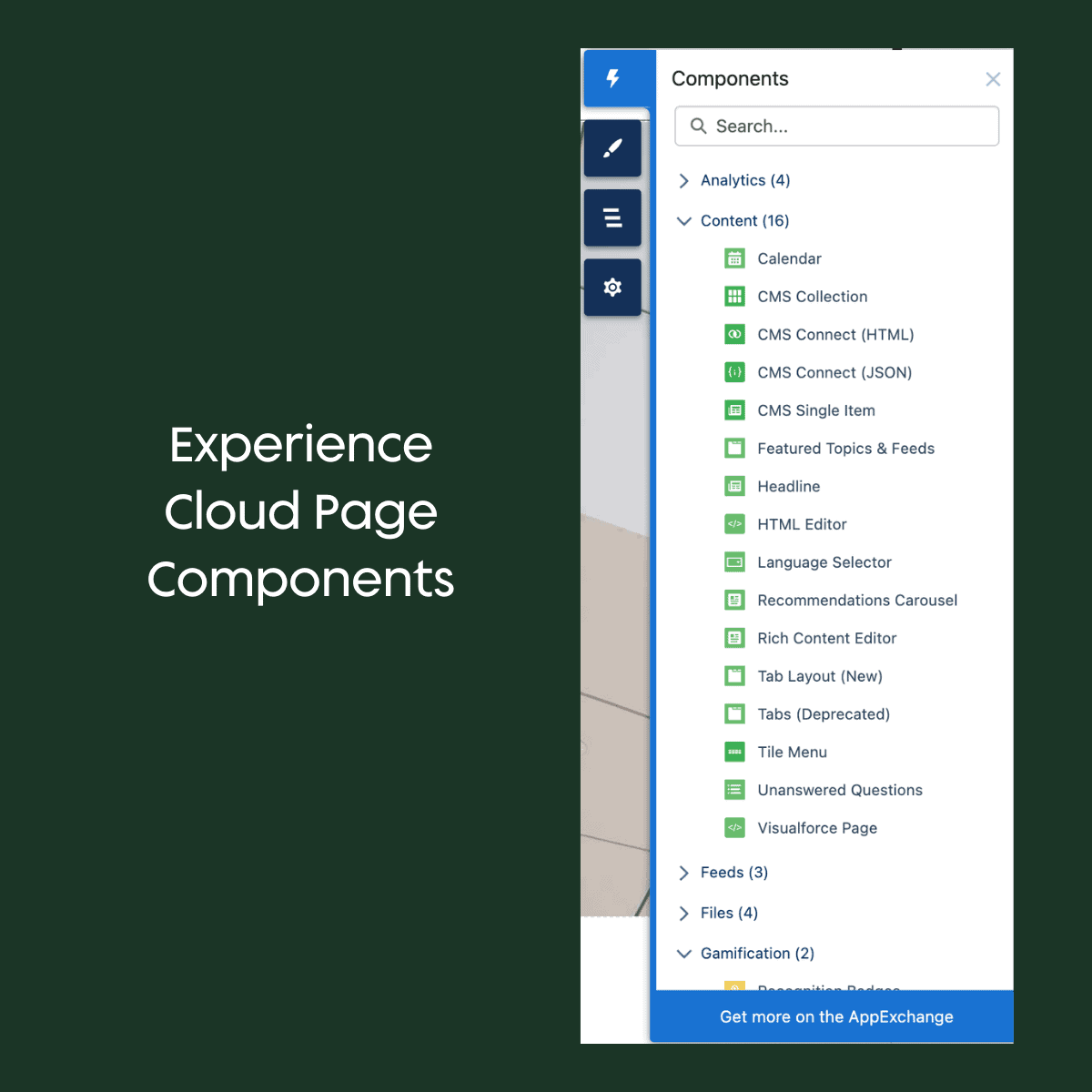 Experience Cloud supports a variety of page types, from login and registration to home and record detail pages. The platform’s modular components make it easy to add analytics, content, feeds, files, gamification, and process automation.
